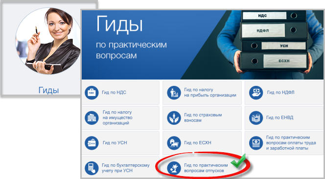 Кроме того, в системах «Помощник Бухгалтера» вы можете воспользоваться Гидом по практическим вопросам отпусков.