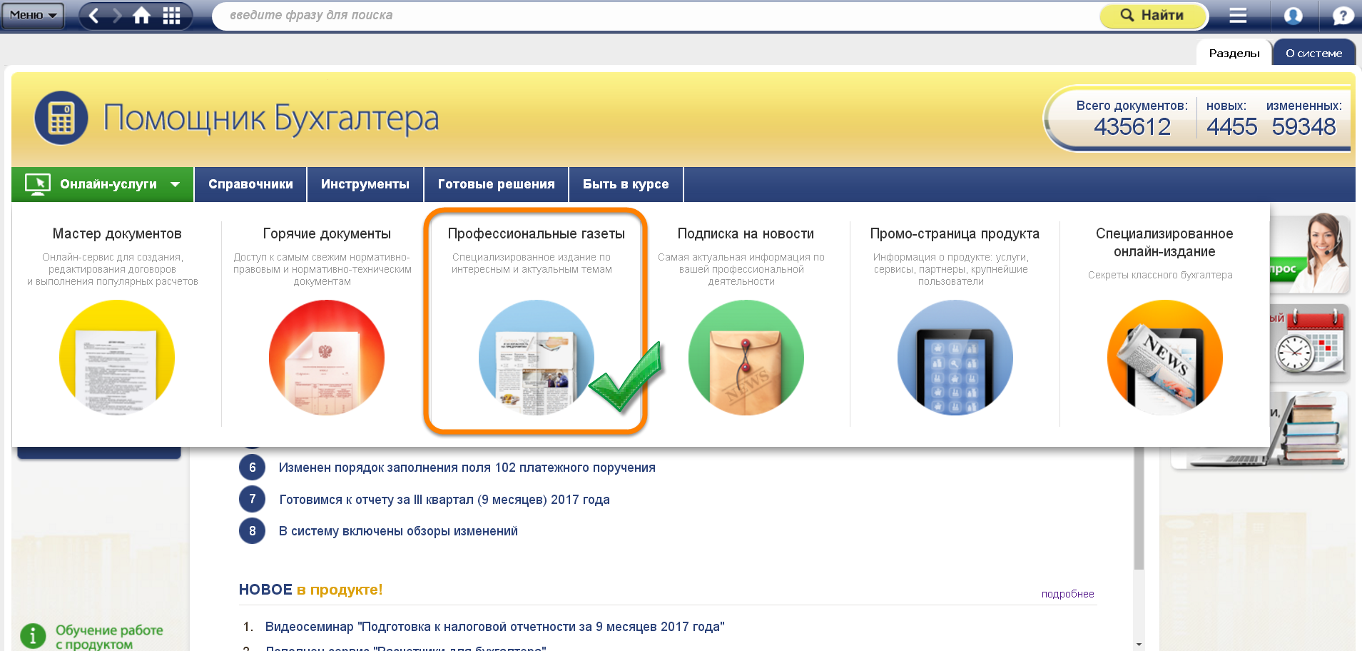 Надо зайти в онлайн-услуги системы «Помощник Бухгалтера» и нажать кнопку «Профессиональные газеты».