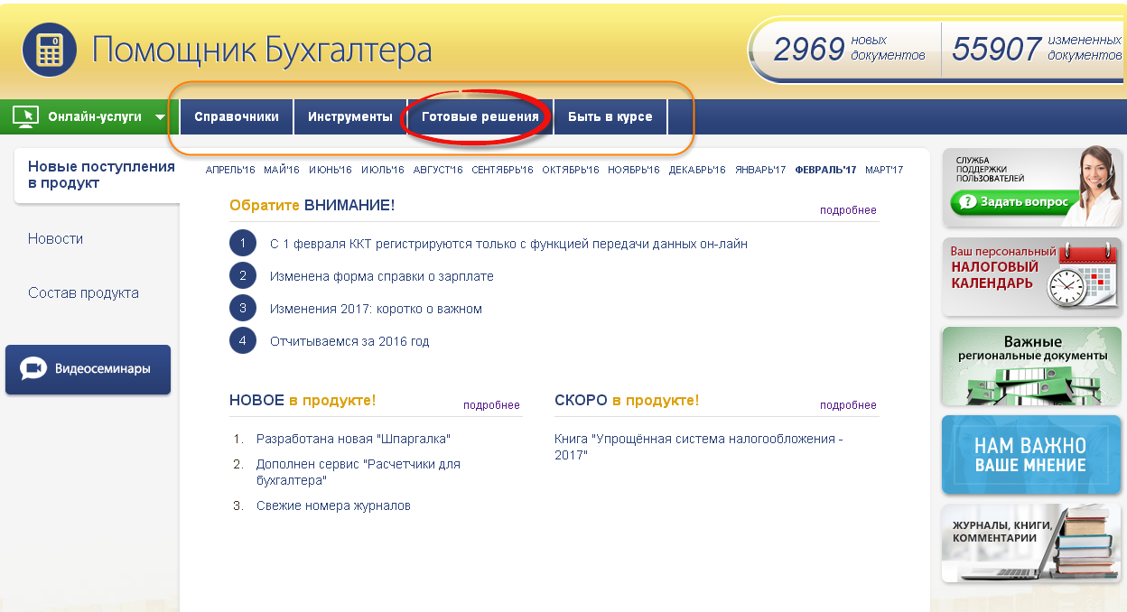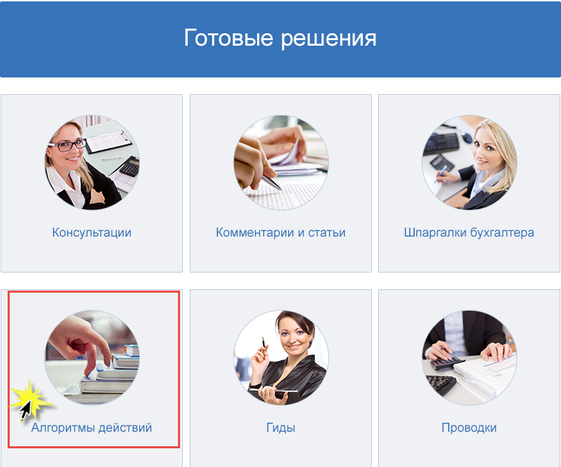 Сервис «Алгоритмы действий» — дополнительная возможность для специалиста сориентироваться в выполнении ежедневных задач и получить готовые решения. Раздел «Алгоритмы действий» вы найдете в блоке «Готовые решения», который расположен на главной странице системы «Помощник Бухгалтера».