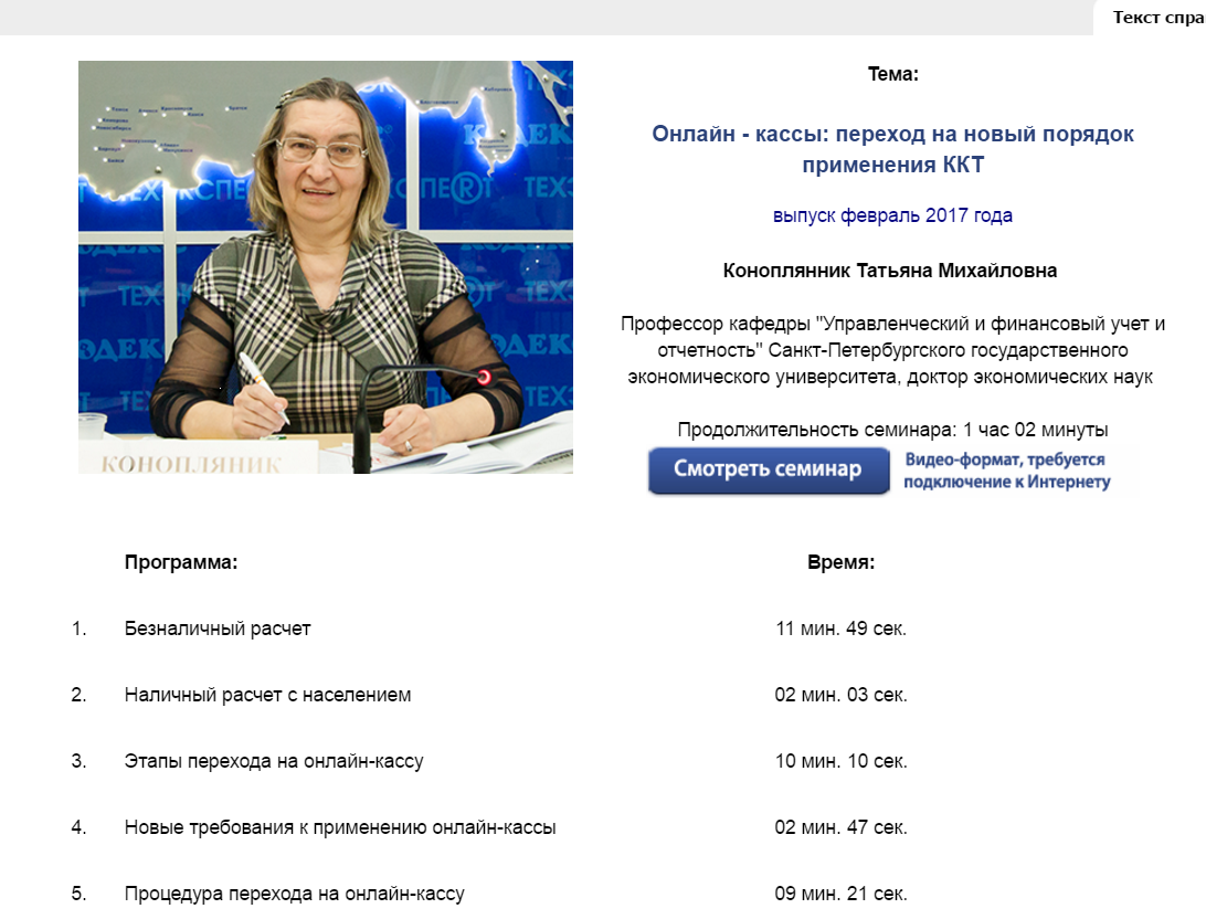 Кроме того, в системе «Помощник Бухгалтера» размещен видеосеминар на тему «Онлайн-кассы: переход на новый порядок применения ККТ». Семинар провела Коноплянник Татьяна Михайловна, профессор кафедры «Управленческий и финансовый учет и отчетность» Санкт-Петербургского государственного экономического университета, доктор экономических наук.