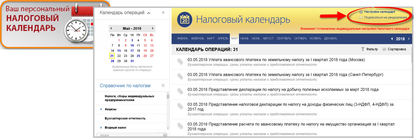Чтобы не пропустить сроки уплаты налогов или предоставления отчетности, воспользуйтесь функцией «настройка Налогового календаря» в системе «Помощник Бухгалтера». С помощью индивидуальной настройки вы создадите «Ваш персональный налоговый календарь» с информацией о необходимых датах и операциях по уплате предстоящих налогов.