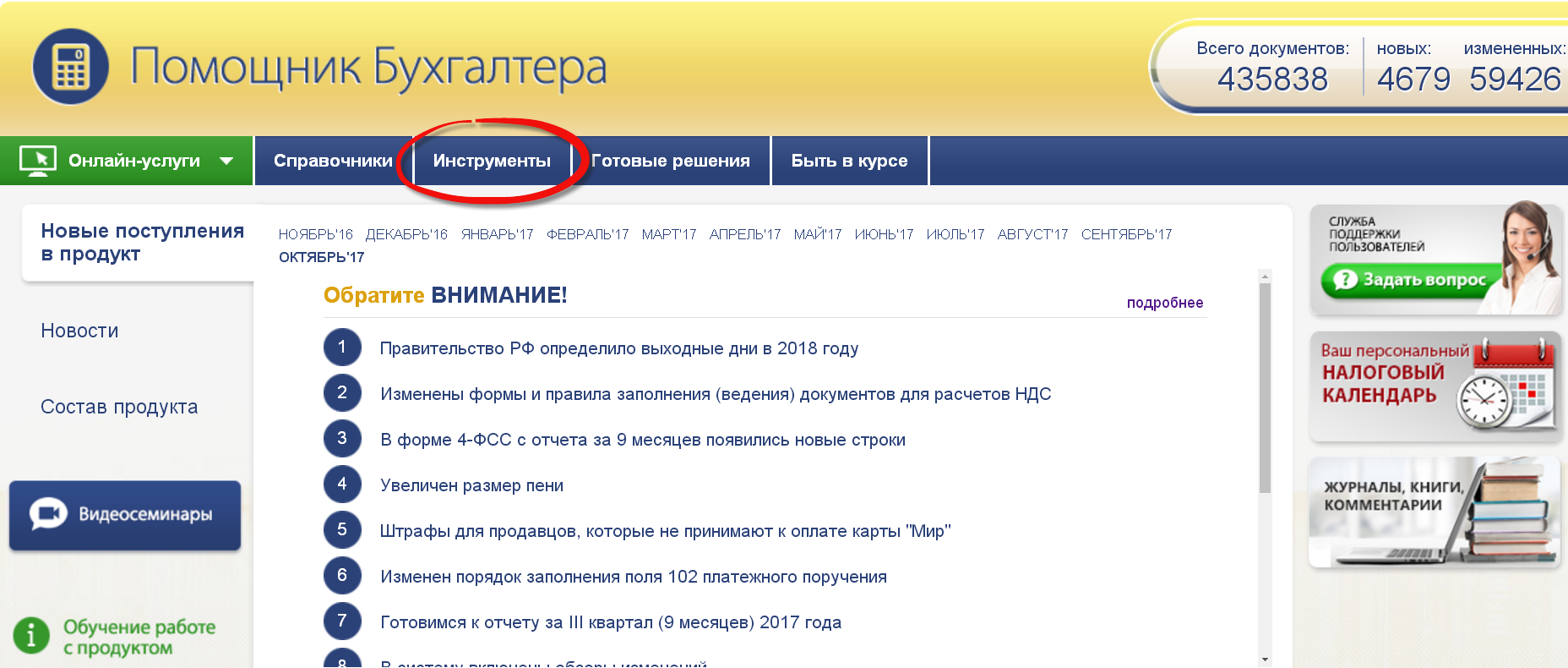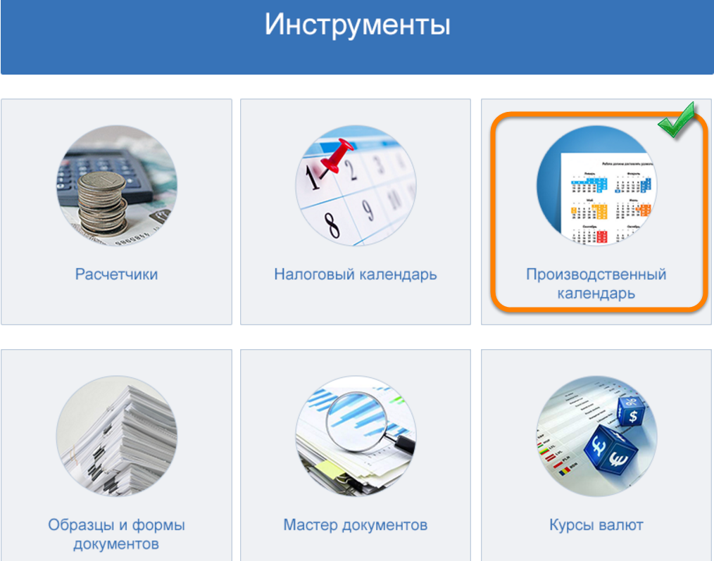 Найти производственный календарь можно на Главной странице системы «Помощник Бухгалтера» в блоке «Инструменты».