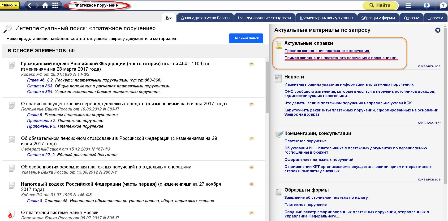 Чтобы найти необходимую вам информацию по заполнению платежного поручения в системе «Помощник Бухгалтера», введите в поисковую строку запрос «платежное поручение».