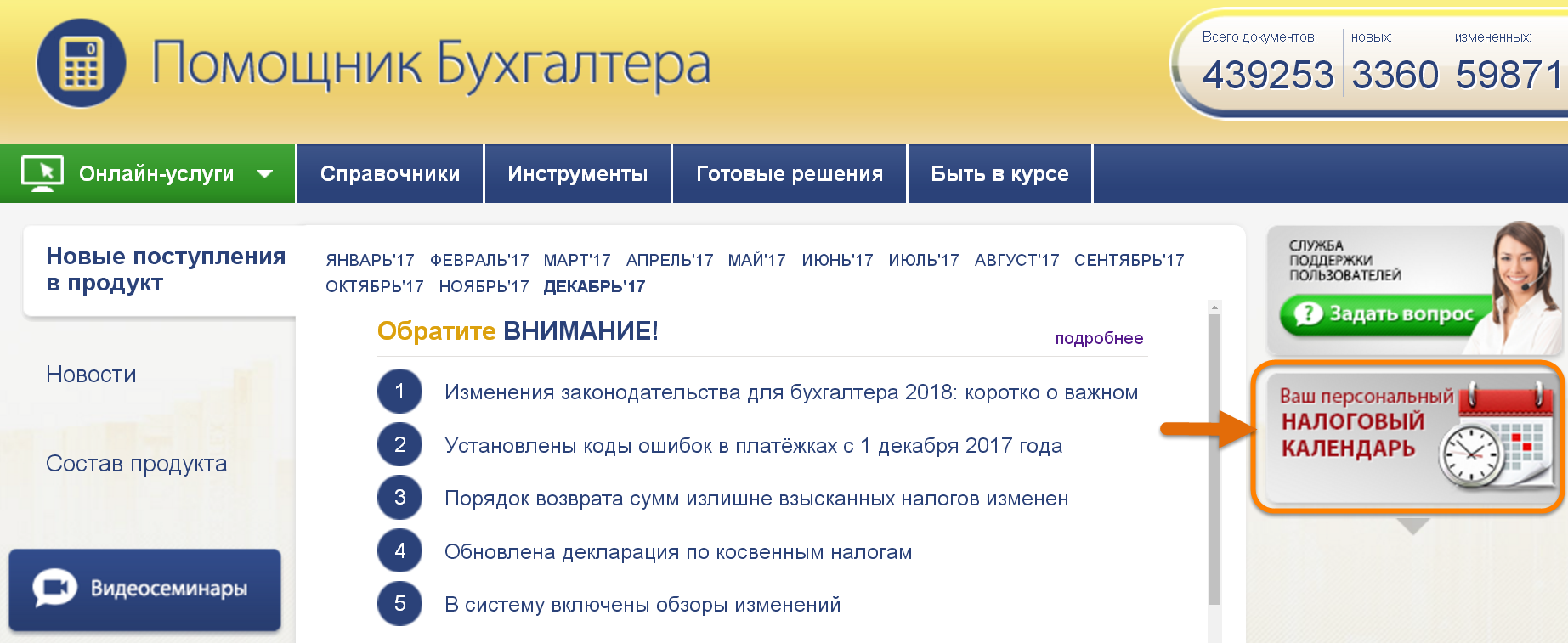 Данный календарь легко найти под баннером быстрого доступа на странице системы «Помощник Бухгалтера».