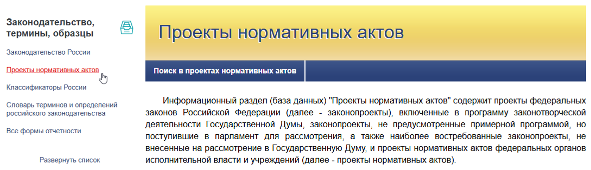 Отслеживать законодательные инициативы на ранних стадиях поможет специализированный сервис «Проекты нормативных актов». Он предоставляет: